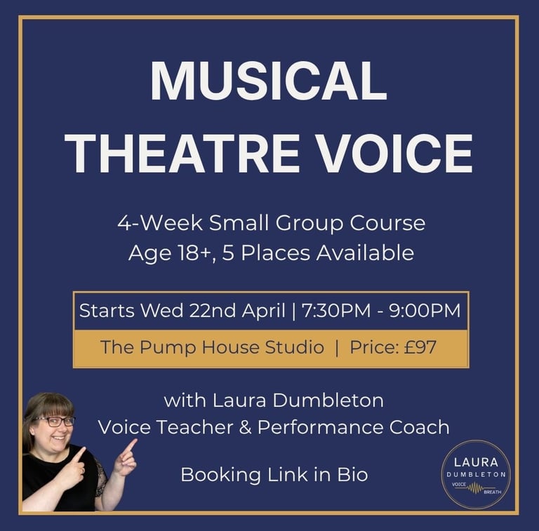 A small group course for adult amateur musical theatre performers ready to stop just getting through the show. Mix voice, belting, breath, performance technique, and a mini showcase in a group of five with proper individual attention.